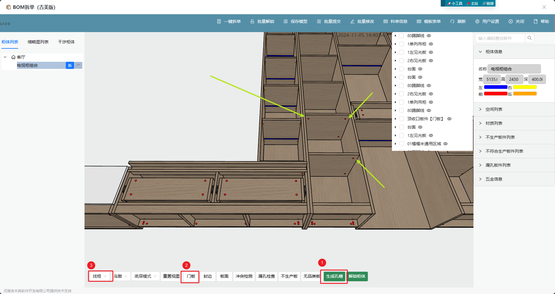 为了检查大饼孔朝向是否美观,可在bom拆单里先生成孔槽数据后,开启“线框”显示模式,并将门板隐藏,然后进行板件大饼孔朝向的审查;