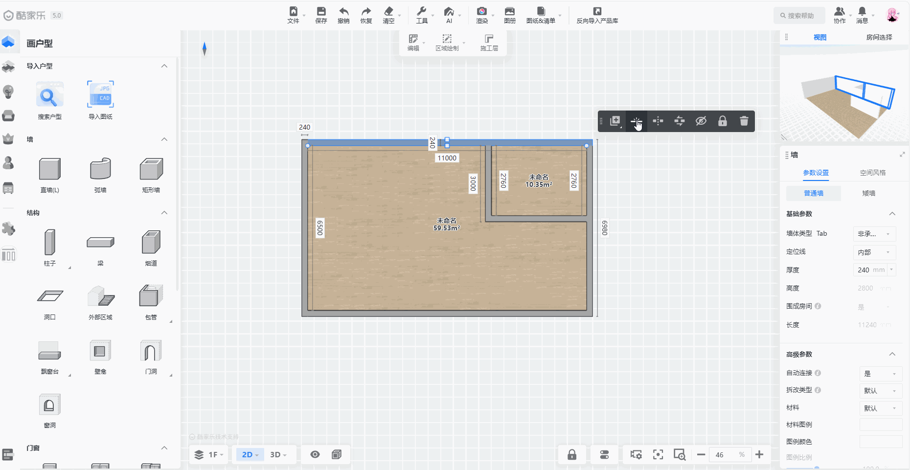 第一步:完成保存原始结构后,在画布新建/拆除需要调整的墙体