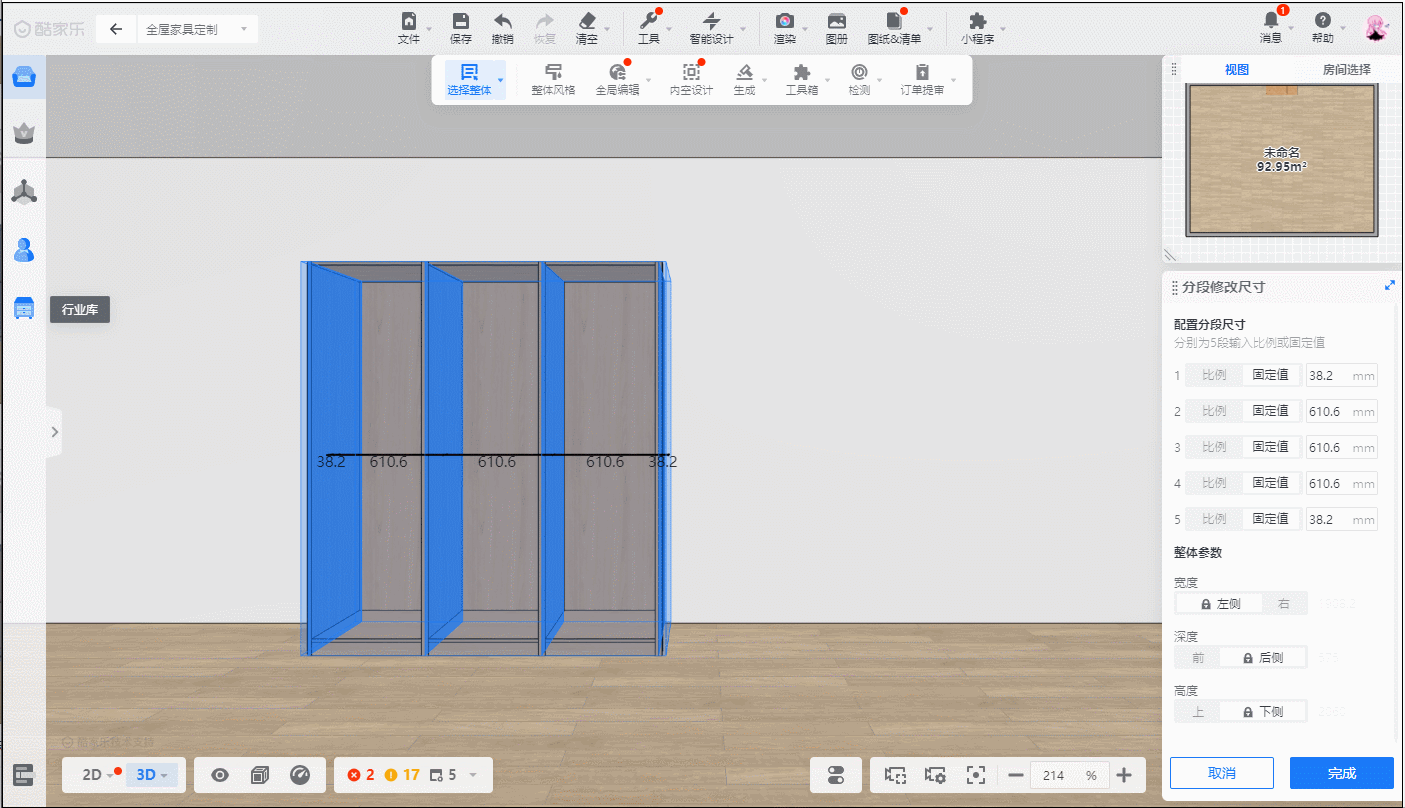 - 对选中的一组柜子的部分柜子设置为固定值,剩余尺寸按比例分给其他柜子