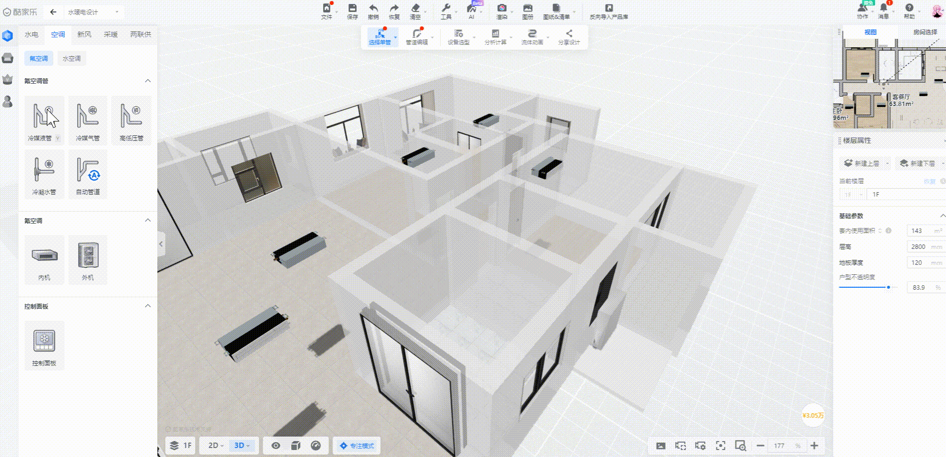 - 空调管线支持2D视图下点点连接,2D视图更高效