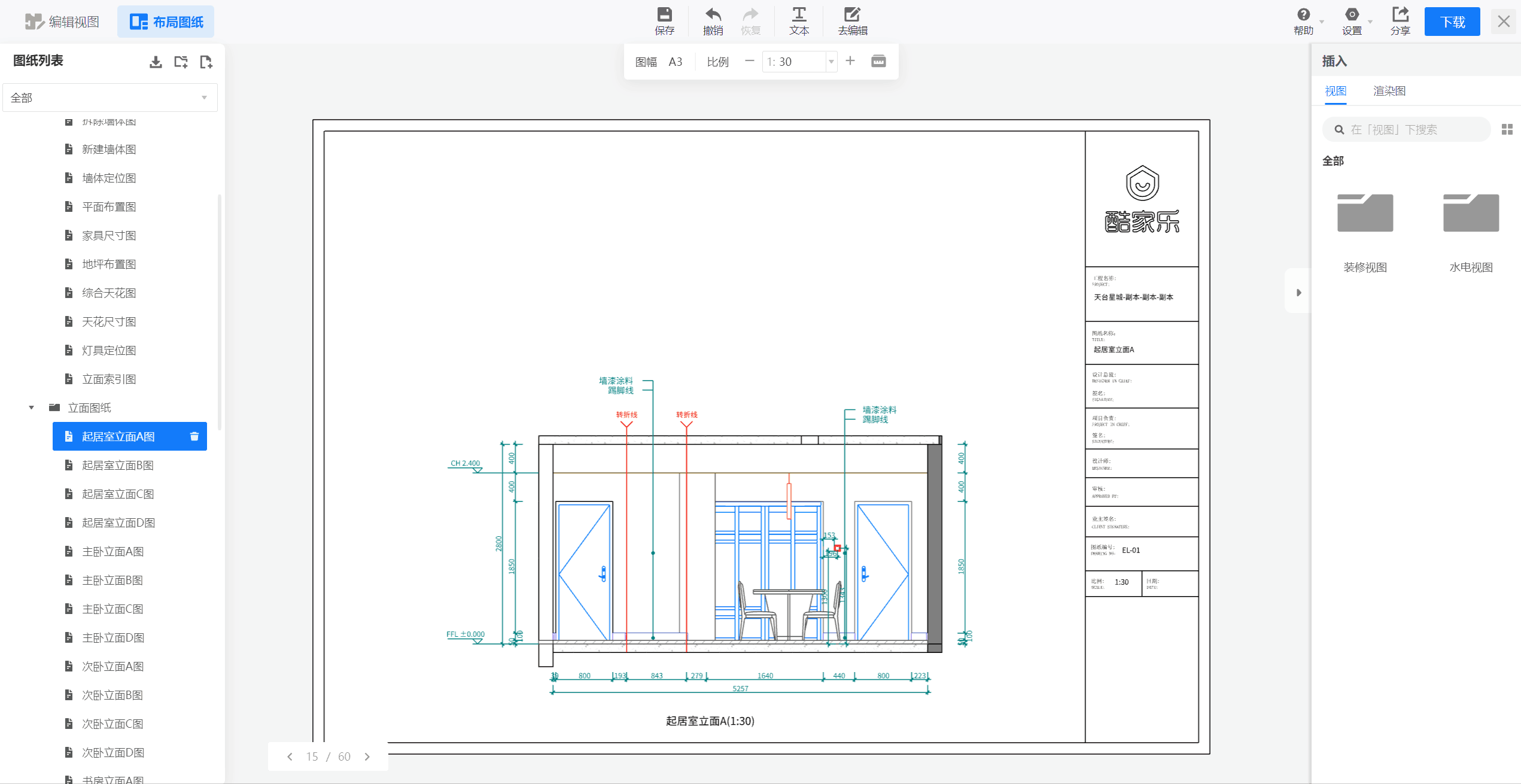 - 通过开启或者关闭开关,控制首次进入施工图,是否需要自动生成立面和局部平面。(如下图:开启状态下,首次进工具时,自动生成立面和局部平面)