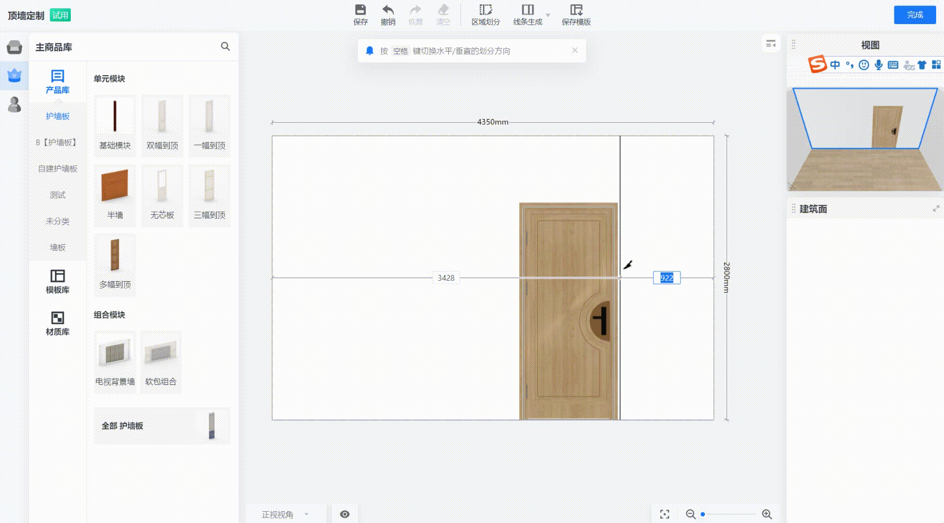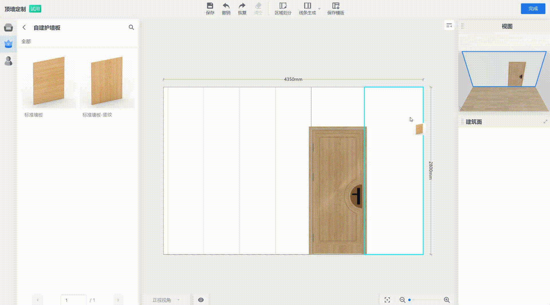 1、从行业库-全屋家具定制 (或门窗定制)中,选中墙面,进到“顶墙定制”中