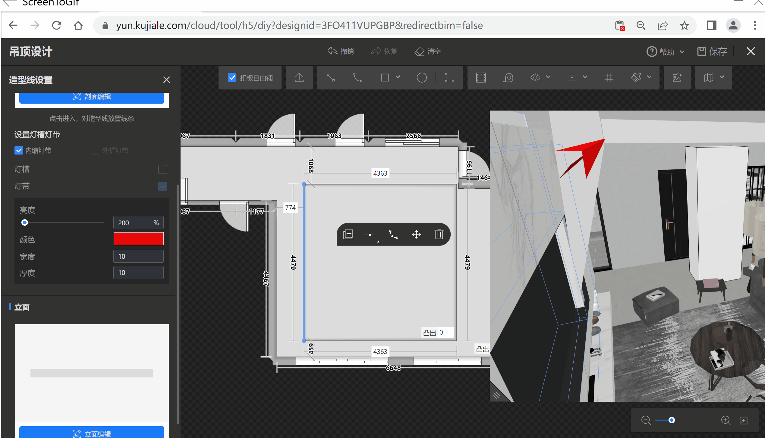 硬装绘制的灯带支持调整尺寸(宽度和厚度),尺寸可输出至图纸