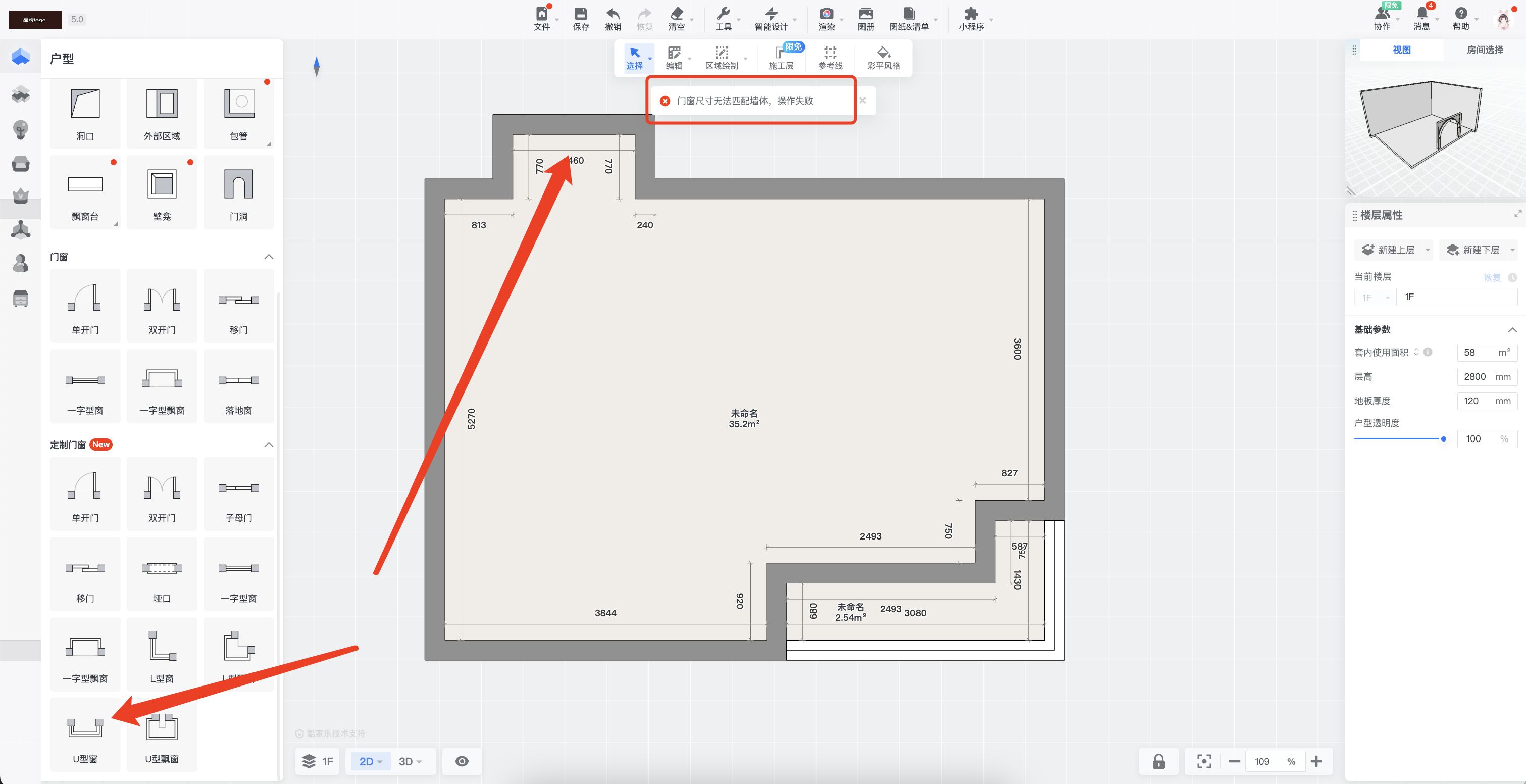 1.放置定制门窗时提示门窗尺寸无法匹配墙体