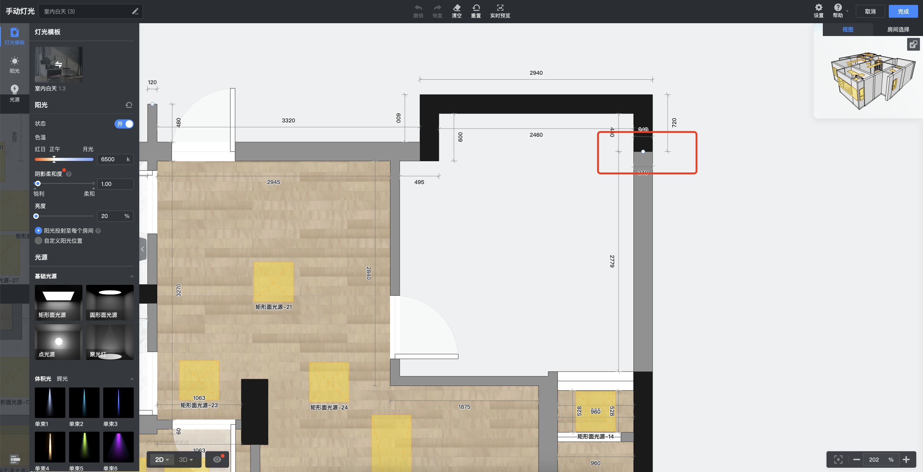 1.房间类型为阳台,避免效果过亮,不会自动生成光源