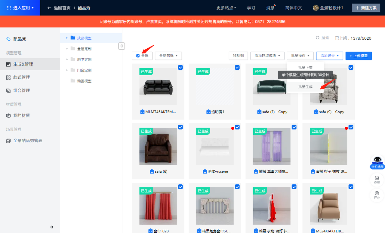 1:操作路径:准备好相应的商品模型,进入“酷品秀→生成&管理”,上传模型、批量生成酷品秀;
