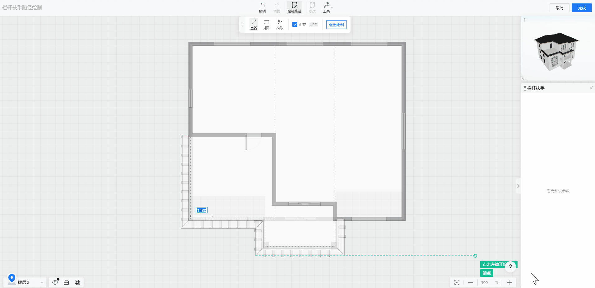 - 画路径——我们在上一步选择好位置后,再画出栏杆扶手的路径,点击完成便能自动生成栏杆扶手。