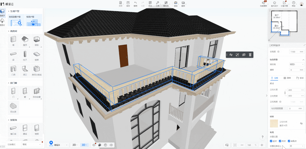 - 调整——可以在右侧参数面板,调整栏杆扶手各项参数(例:立柱尺寸、材质、等)达到你想要的效果~快来体验吧!