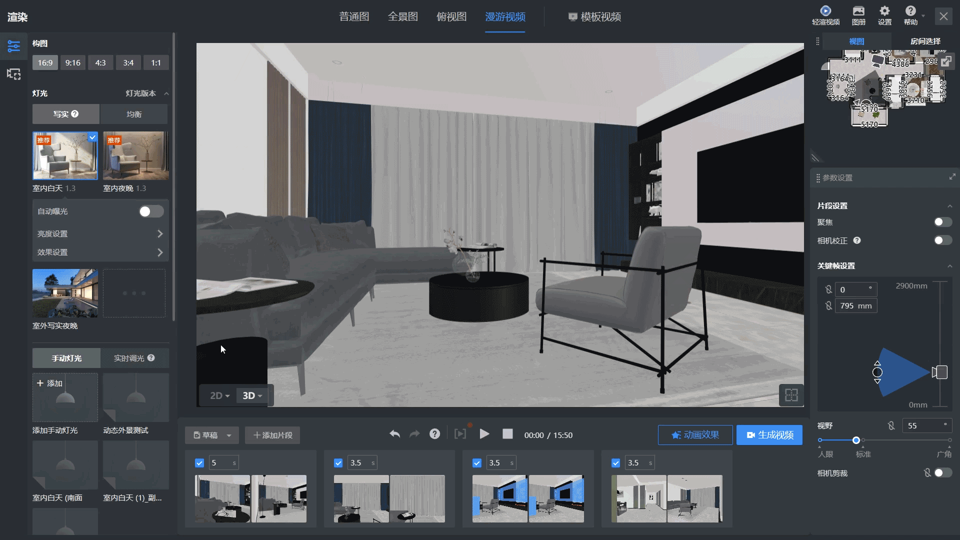 运镜将通过调整摄像机位置、角度和焦距等参数,来实现视角的切换和镜头的移动,然后通过组合不同的运镜来制作家居场景漫游视频。