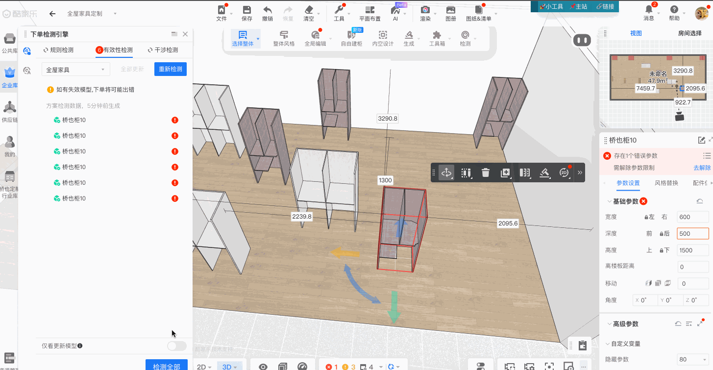 标签本身支持选中后查看对应变化的模型列表,其中【参数变化】类的模型会被默认选中,且在设计场景中自动爆红,以此引导设计师注意审查。当商家在后台设置了有效性检测不允许自动修正默认参数时,更新后会参数会超限,设计师可根据爆红模型,分别对超限模型进行修改:如下图: