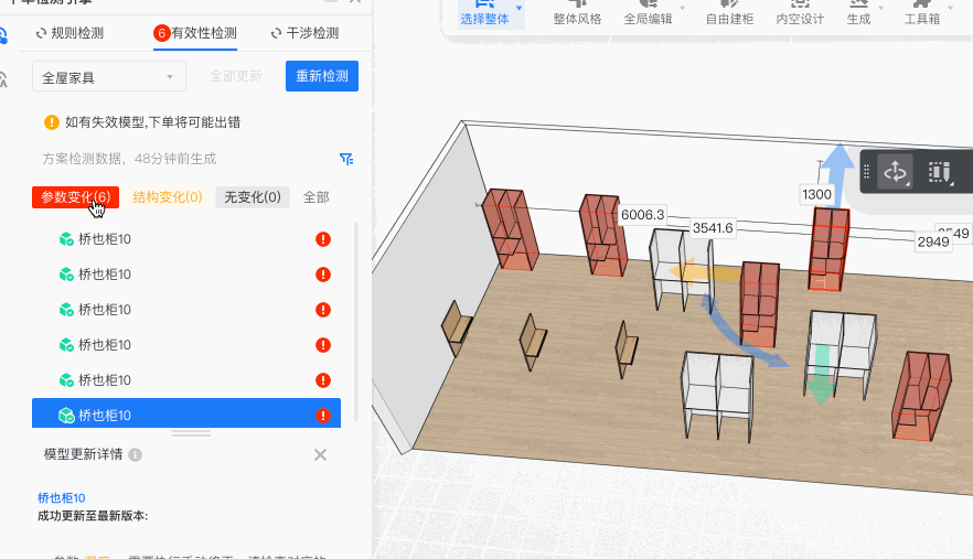 有效性检测的更新可能会导致模型发生参数变更、结构变更,为了使设计师更醒目、清晰的观察到模型更新后的变化情况,我们对有效性检测更新后的面板、设计场景中的三维模型都做了提示增强的能力,参数超限、参数变更的模型将会在设计场景中自动爆红,其他变化也会在更新面板中通过标签分类的形式清晰展示。此外,更新前后无任何变化的模型,将在面板中默认收起,减少提示干扰。